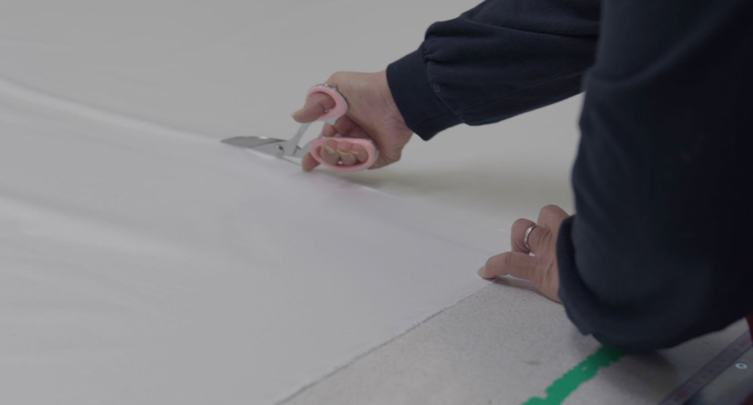 生地の原反から必要数量分を人の手で裁断しています。全て熟練の職人の手で作業しております。