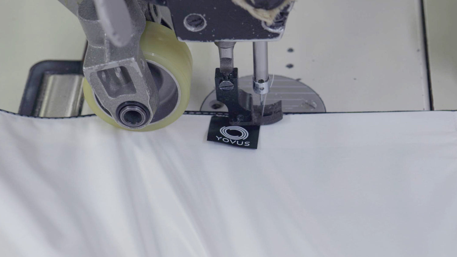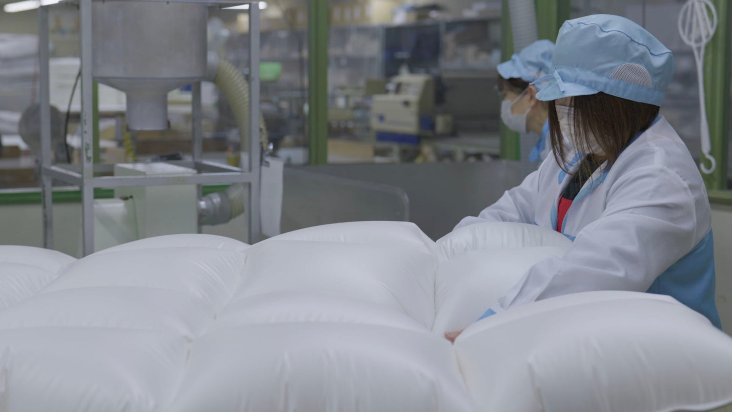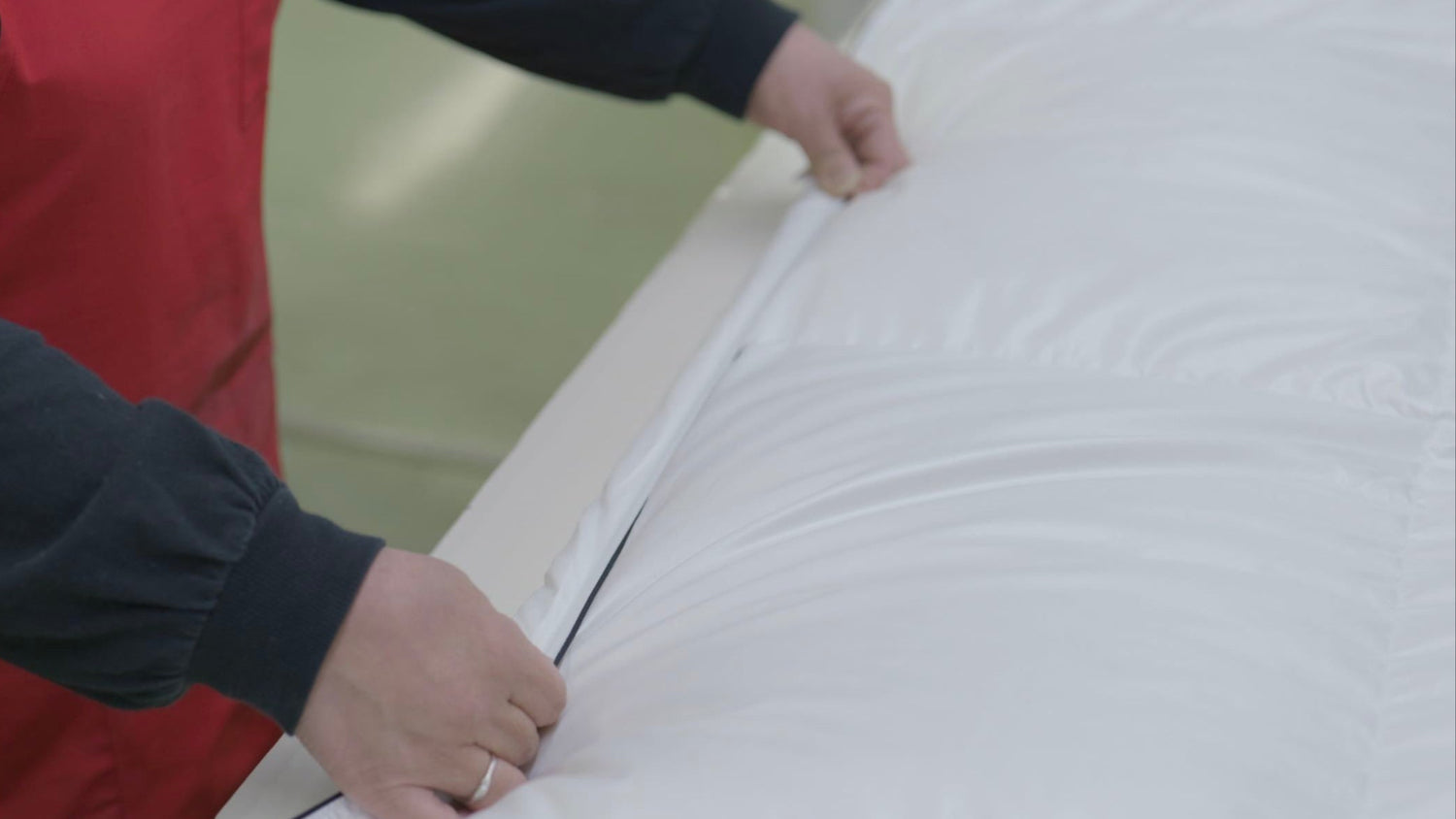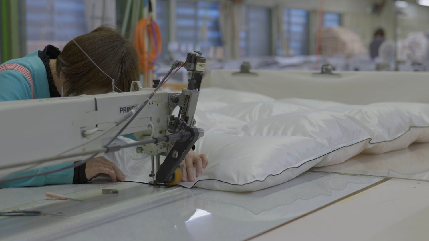 羽毛ふとんの側縫製や小物品の縫製などを行っています。正絹羽毛ふとんでは羽毛の飛び出し防止や製品の綺麗さ、仕上がり強度を重視し、より厳しい社内規定のもと熟練の職人が1枚1枚丁寧に縫製しています。